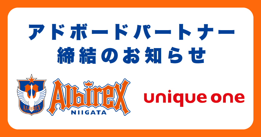 株式会社ユニークワン(本社:新潟県新潟市、代表取締役社長:立川 和行、以下「ユニークワン」)は、日本プロサッカーリーグ(J.LEAGUE)所属のサッカーチームである「アルビレックス新潟」を運営する株式会社アルビレックス新潟(本社:新潟県新潟市、代表取締役社長:野澤 洋輔、以下「アルビレックス新潟」)様と「アドボードパートナー」の契約締結いたしましたことをお知らせいたします。